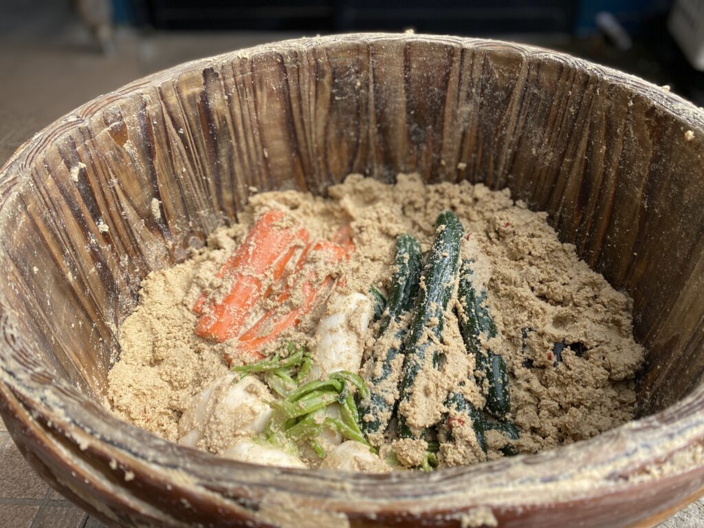 Nukazuke is a traditional Japanese fermented vegetable made by pickling vegetables in rice bran bed called “Nukadoko.”